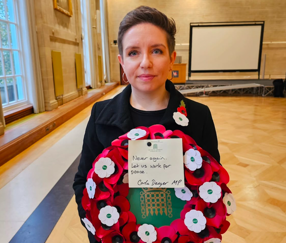 Green Party MP Carla Denyer with a white and red poppy wreath to lay at Bristol's official city ceremony